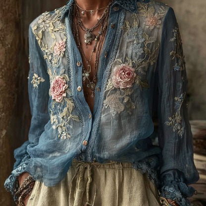 Women's Vintage Bohemian Floral Pattern Linen Long Sleeve Shirt