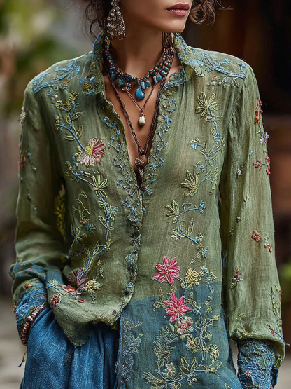 Women's Vintage Floral Embroidered Casual Shirt