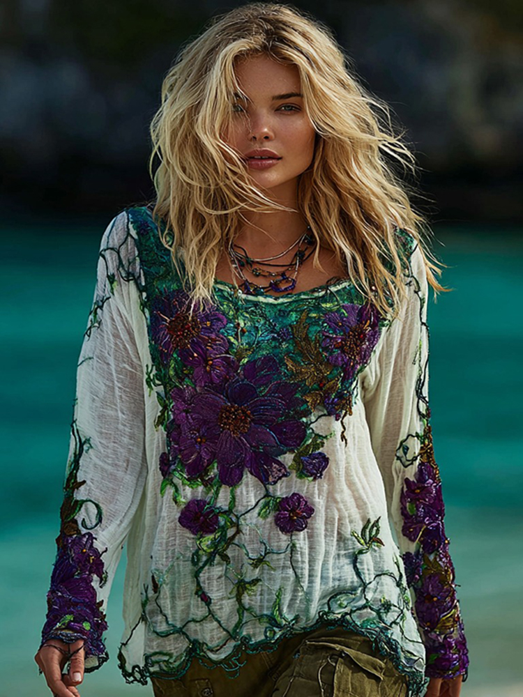 Women's Vintage Floral Long Sleeve Crew Neck T-shirt