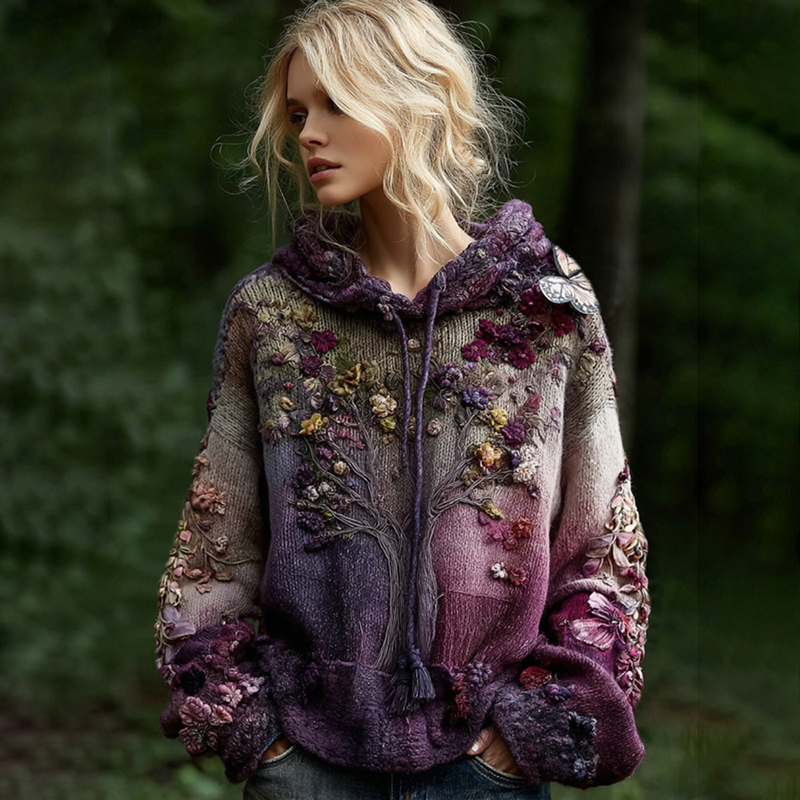 Women's Vintage Life Of Tree Embroidery Gradient Art Cozy Hooded Sweater