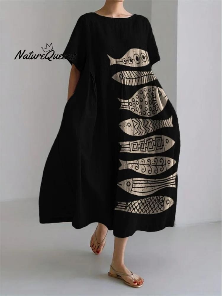 Women's Vintage Lovely Fish Art Print Large Size Loose Casual Dress