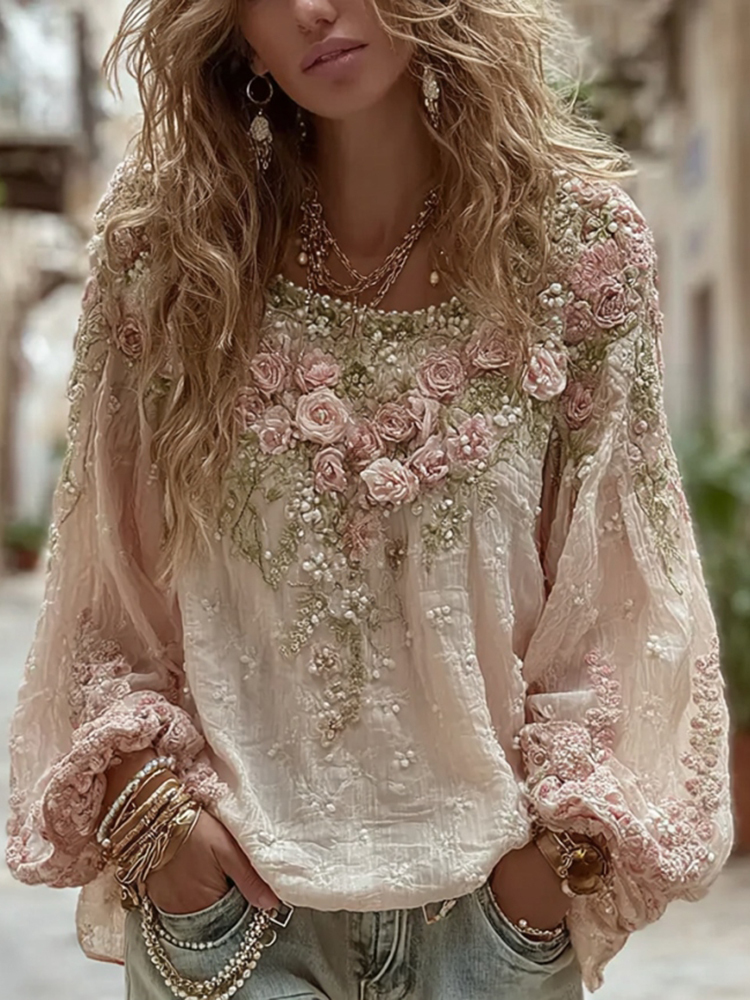 Women's Vintage Pink Rose Embroidery Art Round Neck Long Sleeve T-shirt