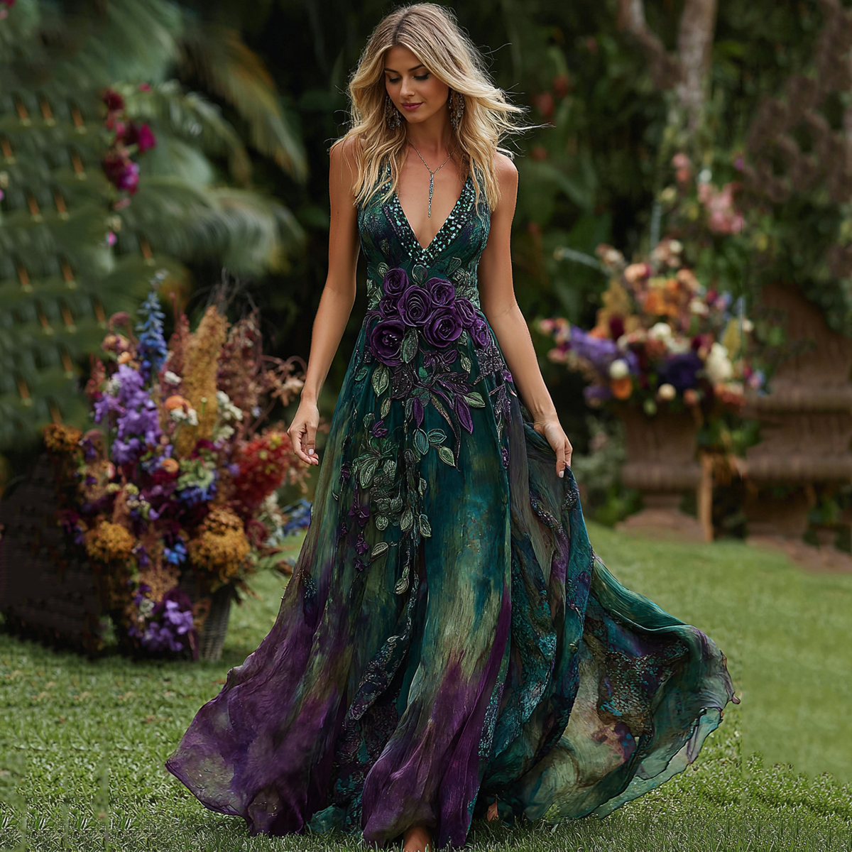 Women's Vintage Purple Floral Art Linen Sleeveless Dress