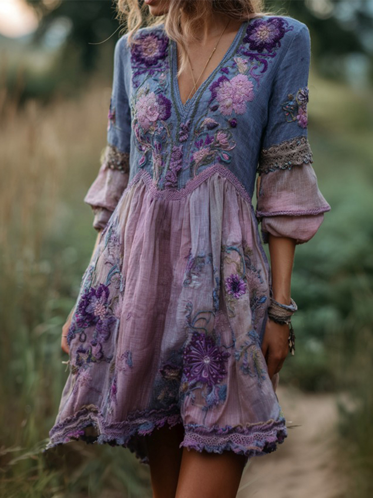 Women's Vintage Purple Floral Art Pattern V-neck Dress