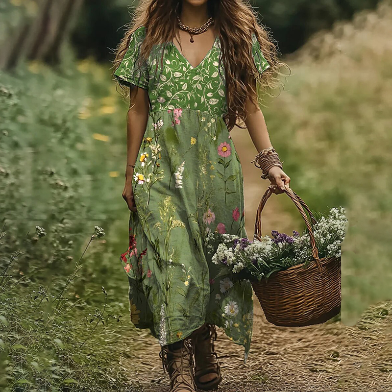 Women's Vintage Wildflower Art Linen V-neck Dress